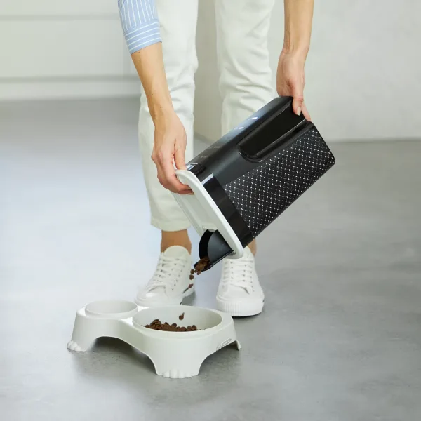 Odpowiednio rozmieszczone uchwyty ułatwiają utrzymanie pojemnika podczas przesypywania karmy, a uchylna klapka w pokrywie zapobiega jej przypadkowemu rozsypywaniu.